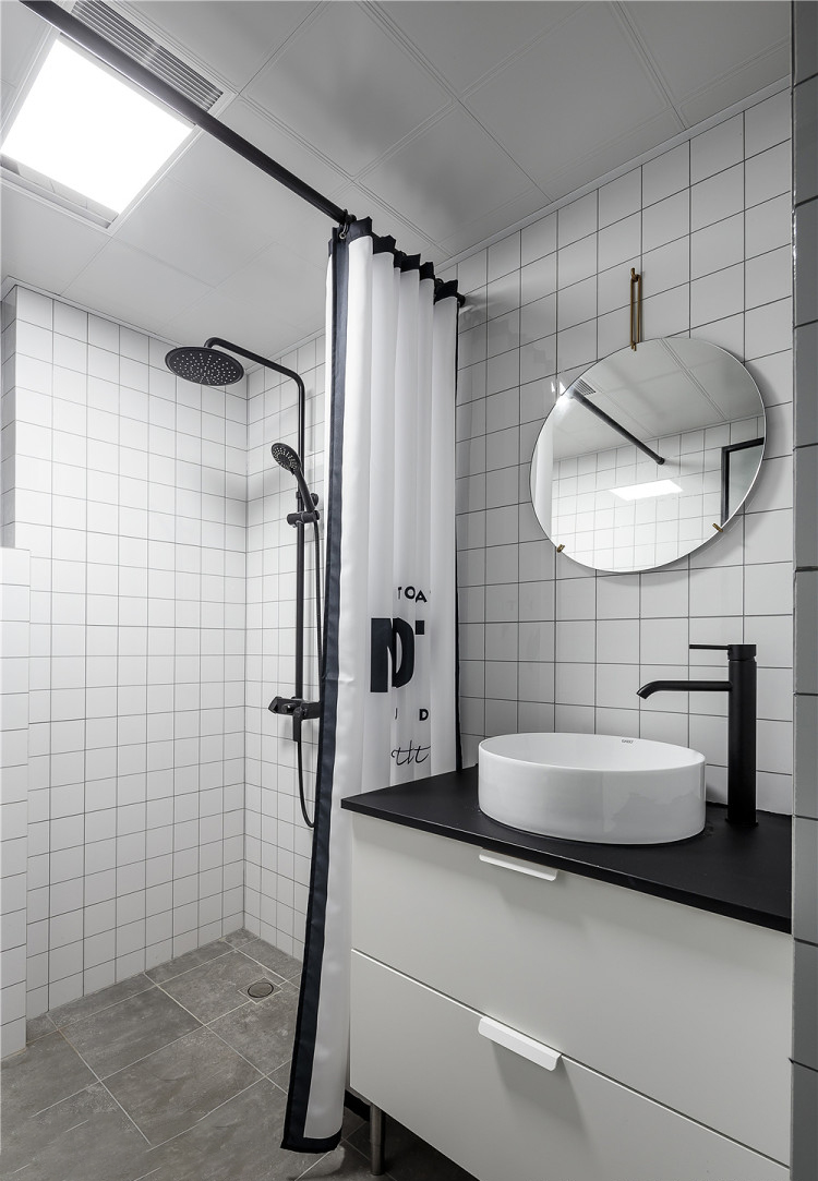 衛生間延續廚房風格,黑白灰三色組合,空間幹淨整潔;采用浴簾將衛生間幹濕分離,不影響使用同時,也減少隔斷對衛生間空間占用。 衛生間蹲廁采用嵌入式水箱,減少空間占用,也保持衛生間美觀,便于清潔。